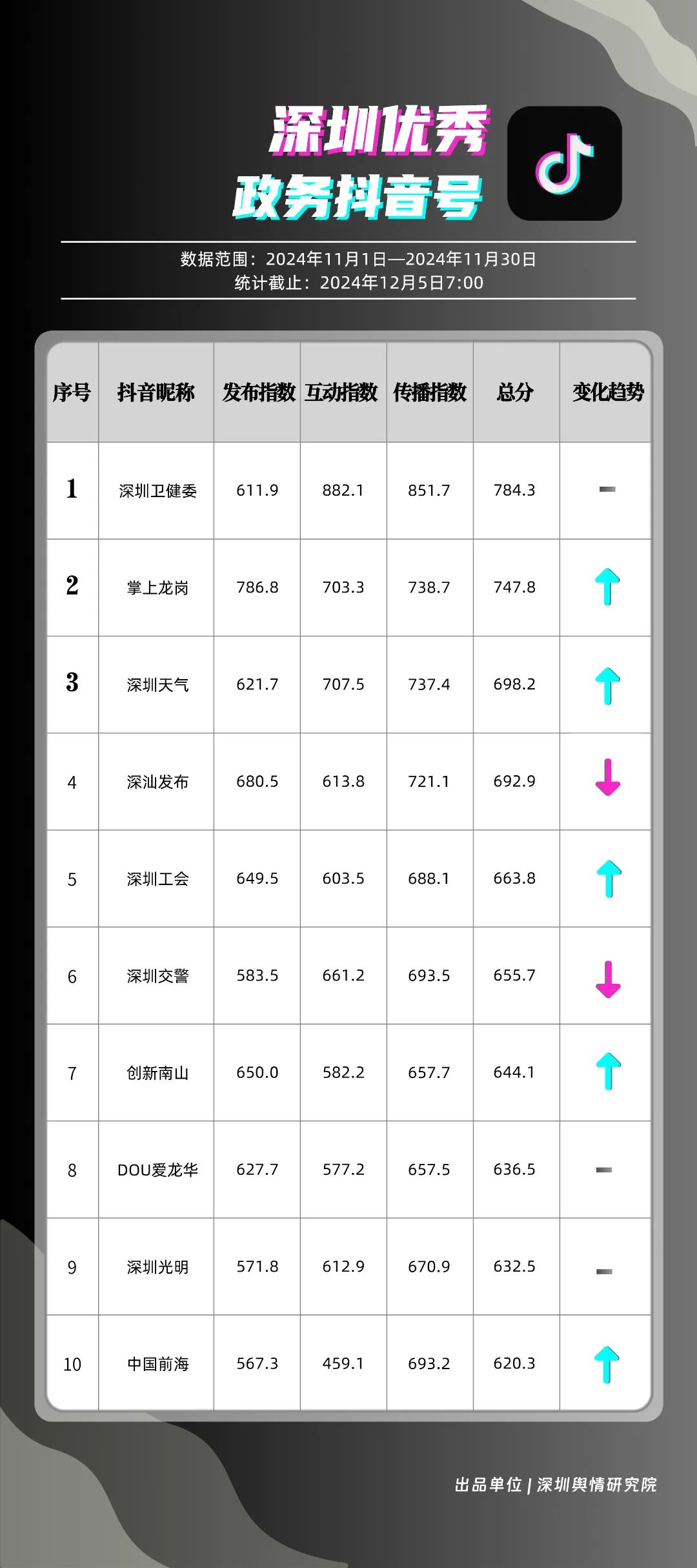 11月,市衛(wèi)生健康委、龍崗區(qū)、市氣象局、南山區(qū)、福田區(qū)、深汕特別合作區(qū)、市交通警察局、市應急管理局、光明區(qū)、龍華區(qū)榮登“深圳優(yōu)秀政務新媒體矩陣”榜單。11月,市衛(wèi)生健康委新媒體矩陣持續(xù)深耕衛(wèi)生健康領域,穩(wěn)固占據(jù)榜單首位。龍崗區(qū)新媒體矩陣則在多平臺發(fā)布《宛宛傾城》這一劇情類視頻,展現(xiàn)了其在內(nèi)容創(chuàng)新上的積極探索。市氣象局新媒體矩陣則以多樣化的天氣播報形式,贏得了廣泛好評,位列榜單第三名。同時,南山區(qū)、福田區(qū)、深汕特別合作區(qū)等新媒體矩陣在各平臺展現(xiàn)出不凡實力,憑借各自優(yōu)勢與精彩的內(nèi)容,在《深圳優(yōu)秀政務新媒體矩陣》榜單中取得靠前名次。