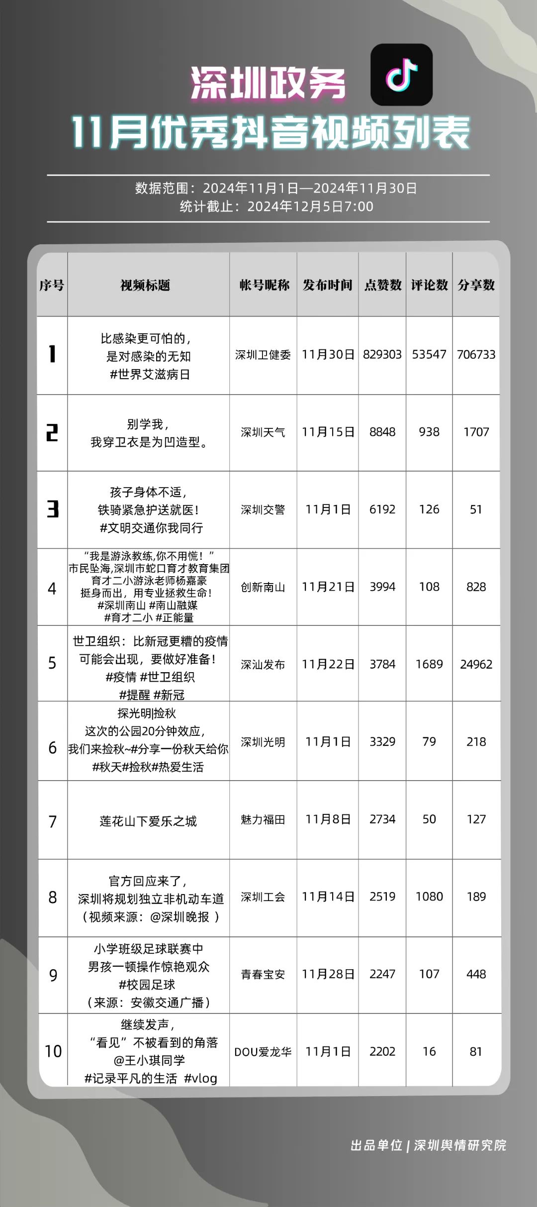 11月,“深圳衛(wèi)健委”“掌上龍崗”“深圳天氣”“深汕發(fā)布”“深圳工會”“深圳交警”“創(chuàng)新南山”“DOU愛龍華”“深圳光明”“中國前?!惫?0個政務抖音號獲得“深圳優(yōu)秀政務抖音號”稱號?!吧钲谛l(wèi)健委”憑借高質(zhì)量劇情內(nèi)容,巧妙融入健康知識,視頻累計收獲近百萬點贊。同時,“掌上龍崗”和“深圳天氣”也在視頻內(nèi)容創(chuàng)新上不斷探索,通過優(yōu)化宣傳策略和信息傳播方式,使得網(wǎng)民能夠在輕松愉快的氛圍中了解龍崗區(qū)的最新動態(tài)和深圳的天氣信息,展現(xiàn)了政務抖音號的獨特魅力與社會影響力。