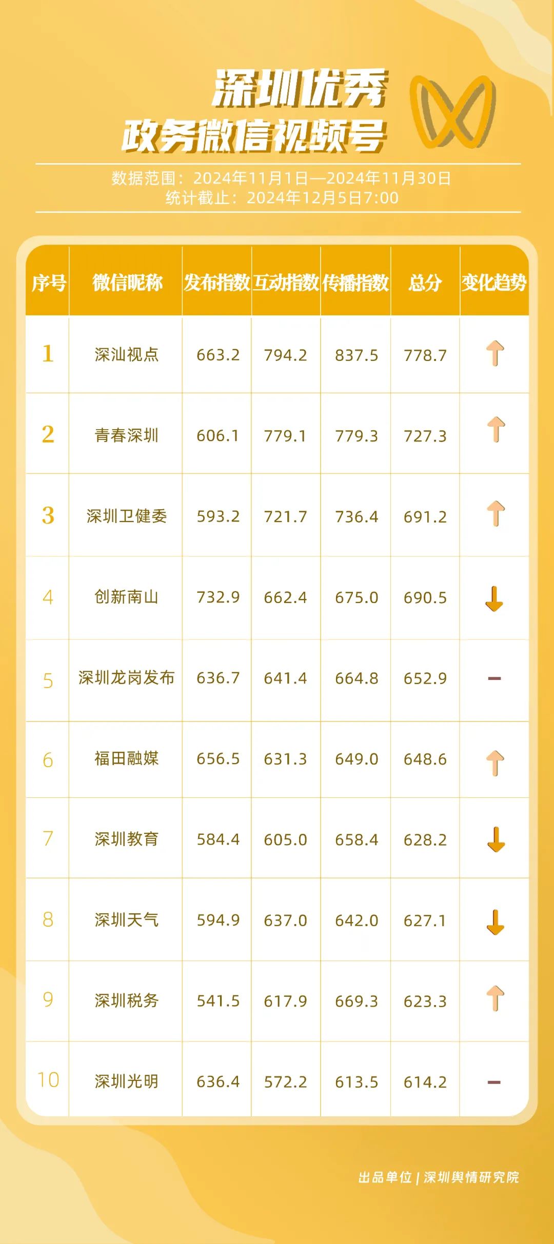 《深圳優(yōu)秀政務新媒體矩陣》將深圳黨政機關、企事業(yè)單位開設的政務公眾號(微信)、微博號、抖音號、視頻號(微信)及頭條號按照發(fā)布指數(shù)、互動指數(shù)、傳播指數(shù)三項指標進行綜合評價,最終形成優(yōu)秀名單。