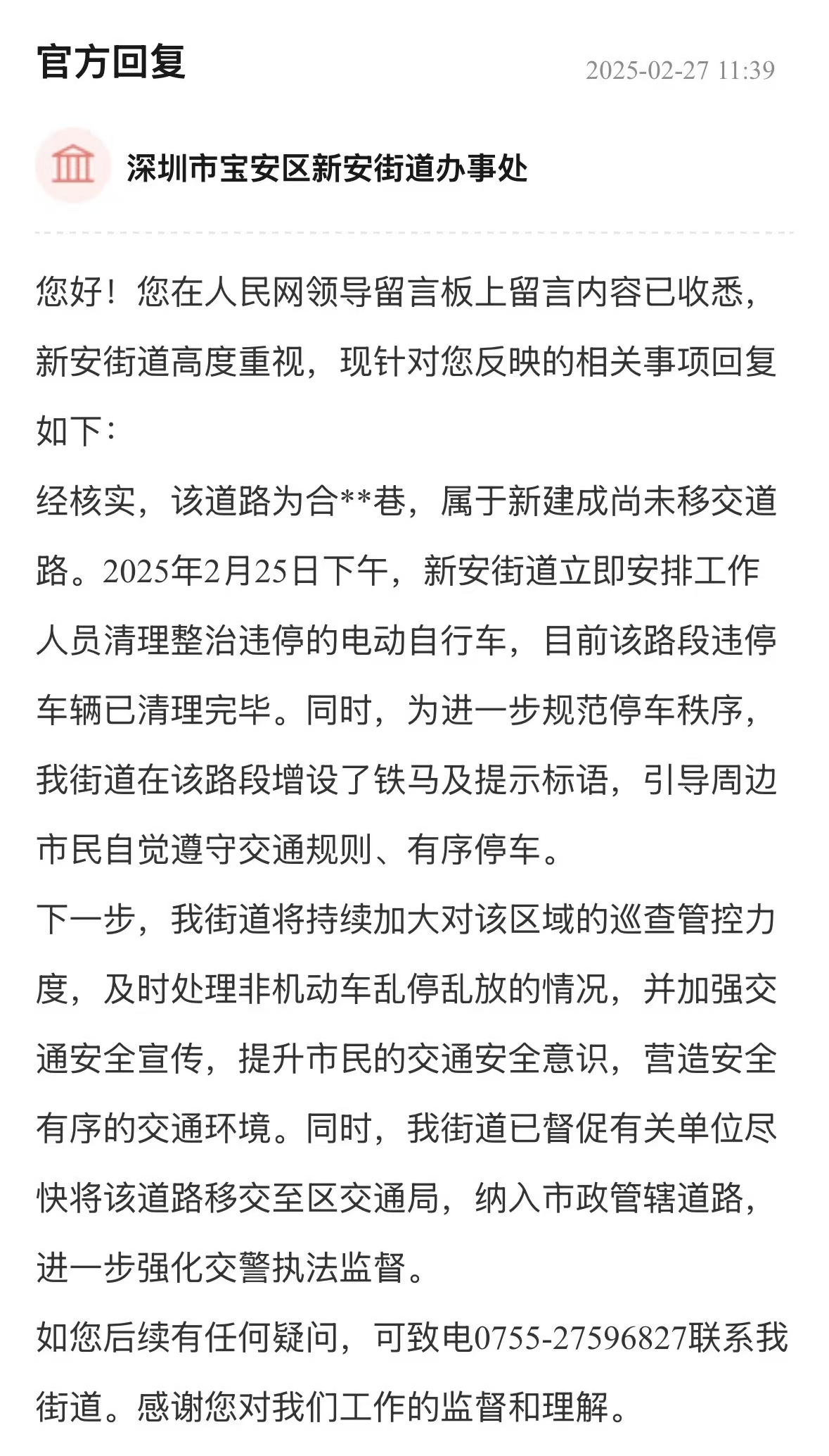 案例點(diǎn)評(píng):非機(jī)動(dòng)車(chē)亂停放影響交通和消防安全,嚴(yán)重影響市民生活。街道辦行動(dòng)迅速,第一時(shí)間清理違停車(chē)輛,增設(shè)鐵馬及提示標(biāo)語(yǔ),規(guī)范停車(chē)秩序,展現(xiàn)了高效的處置能力?;貞?yīng)中,街道還制定了長(zhǎng)效治理計(jì)劃,構(gòu)建“短期整治+長(zhǎng)效管理”模式,有助于解決區(qū)域交通問(wèn)題,提升城市管理水平。