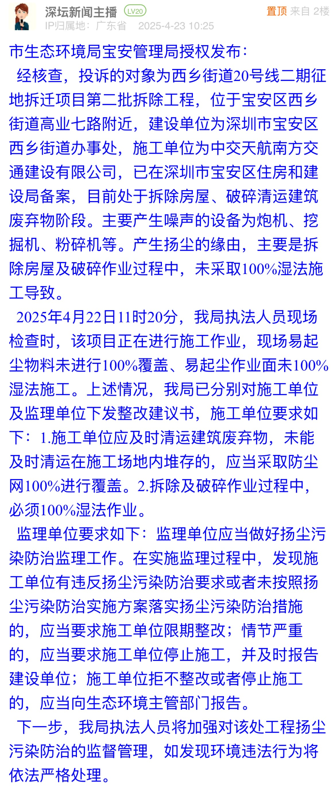 市民反映工地未落實(shí)降塵措施問題,直接關(guān)乎周邊環(huán)境質(zhì)量,生態(tài)環(huán)境局寶安管理局快速響應(yīng),第一時(shí)間核查鎖定責(zé)任主體,明確施工與監(jiān)理單位整改要求,回應(yīng)既及時(shí)又切中要害。從問題反饋到措施落地的全流程,體現(xiàn)了該局對(duì)市民訴求的高度重視,更展現(xiàn)出生態(tài)監(jiān)管部門“民有所呼、立行立改”的責(zé)任擔(dān)當(dāng),切實(shí)守護(hù)市民的呼吸安全。
