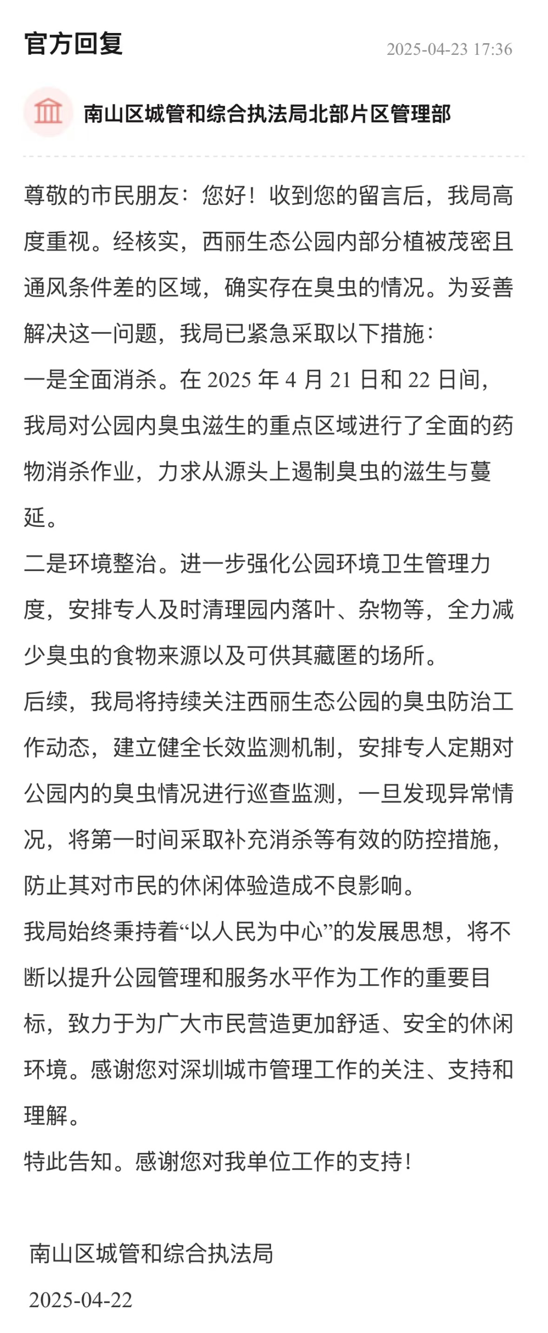 案例點(diǎn)評(píng):臭蟲侵?jǐn)_住戶問題與居民生活舒適度息息相關(guān)。南山區(qū)城管部門快速響應(yīng),在問題反饋后48小時(shí)內(nèi)即開展消殺,遏制臭蟲蔓延;同步強(qiáng)化環(huán)境整治,切斷滋生鏈條。更值得肯定的是,回應(yīng)中還表示將建立健全長效監(jiān)測(cè)機(jī)制,動(dòng)態(tài)跟蹤蟲情并及時(shí)采取措施,充分體現(xiàn)出該局問題發(fā)現(xiàn)快、處置措施實(shí)、長效保障穩(wěn)的務(wù)實(shí)作風(fēng)。