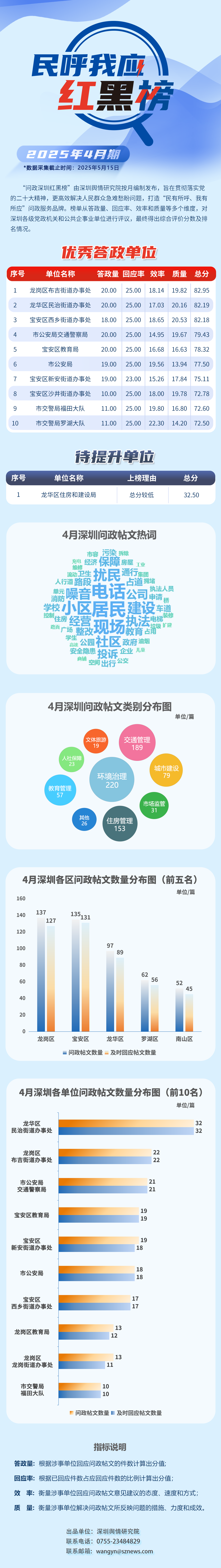 本期榜單采集的帖文主要來自深圳市及各區(qū)政府官網(wǎng)、深圳論壇、人民網(wǎng)領(lǐng)導(dǎo)留言板、深圳新聞網(wǎng)“民呼我應(yīng)”等平臺(tái),所采集帖文發(fā)布時(shí)間為2025年4月1日至4月30日,采集截止時(shí)間為2025年5月15日。