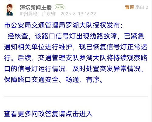 經核查,該路口信號燈出現線路故障,已緊急通知相關單位進行維護,現已恢復信號燈正常運行。后續(xù),交通管理支隊羅湖大隊將持續(xù)觀察路口的信號燈運行情況,及時處置突發(fā)異常情況,保障路口交通安全、暢通、有序。