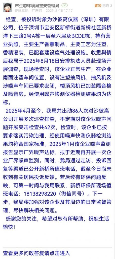 經查,被投訴對象為沙彼高儀器(深圳)有限公司,位于深圳市寶安區(qū)新橋街道新橋社區(qū)新橋洋下三路2號A棟一層至六層及BCDE棟,持有營業(yè)執(zhí)照,主要生產香薰制品,主要工藝為注塑、香精灌裝,已配套建設廢氣處理設施。收悉輿情后我局于2025年8月18日安排執(zhí)法人員赴現場開展調查?,F場檢查時,該企業(yè)正常生產,在企業(yè)南面注塑車間位置,設有注塑抽風機,抽風機及涉噪聲車間已要求密閉,樓頂風機已加裝隔音棉及隔音房。經使用噪聲快測儀器檢測結果均為達標。
