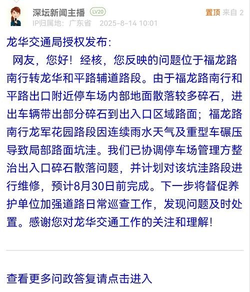 網友,您好!經核,您反映的問題位于福龍路南行轉龍華和平路輔道路段。由于福龍路南行和平路出口附近停車場內部地面散落較多碎石,進出車輛帶出部分碎石到出入口區(qū)域路面;福龍路南行龍軍花園路段因連續(xù)雨水天氣及重型車碾壓導致局部路面坑洼。我們已協(xié)調停車場管理方整治出入口碎石散落問題,并計劃對該坑洼路段進行維修,預計8月30日前完成。下一步將督促養(yǎng)護單位加強道路日常巡查工作,發(fā)現問題及時處置。感謝您對龍華交通工作的關注和理解!