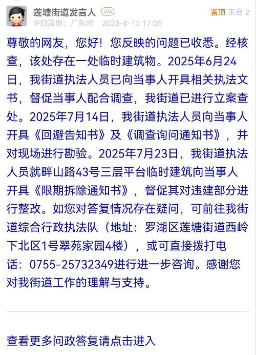 尊敬的網友,您好!您反映的問題已收悉。經核查,該處存在一處臨時建筑物。2025年6月24日,我街道執(zhí)法人員已向當事人開具相關執(zhí)法文書,督促當事人配合調查,我街道已進行立案查處。2025年7月14日,我街道執(zhí)法人員向當事人開具《回避告知書》及《調查詢問通知書》,并對現場進行勘驗。2025年7月23日,我街道執(zhí)法人員就畔山路43號三層平臺臨時建筑向當事人開具《限期拆除通知書》,督促其對違建部分進行整改。如您對答復情況存在疑問,可前往我街道綜合行政執(zhí)法隊(地址:羅湖區(qū)蓮塘街道西嶺下北區(qū)1號翠苑家園4樓),或可直接撥打電話:0755-25732349進行進一步咨詢。感謝您對我街道工作的理解與支持。