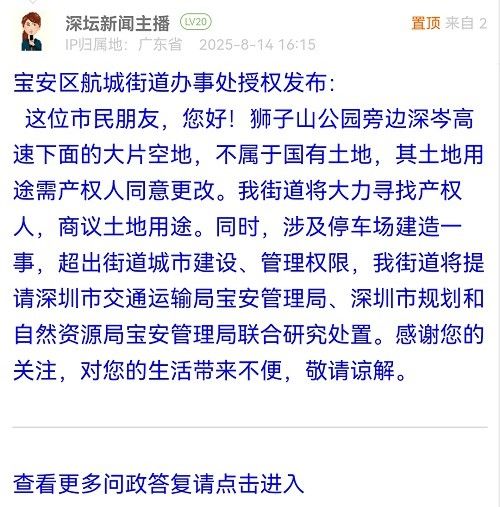 這位市民朋友,您好!獅子山公園旁邊深岑高速下面的大片空地,不屬于國有土地,其土地用途需產權人同意更改。我街道將大力尋找產權人,商議土地用途。同時,涉及停車場建造一事,超出街道城市建設、管理權限,我街道將提請深圳市交通運輸局寶安管理局、深圳市規(guī)劃和自然資源局寶安管理局聯合研究處置。感謝您的關注,對您的生活帶來不便,敬請諒解。