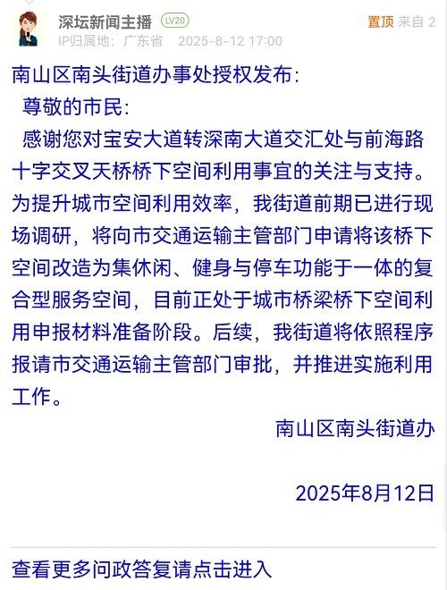 感謝您對寶安大道轉深南大道交匯處與前海路十字交叉天橋橋下空間利用事宜的關注與支持。為提升城市空間利用效率,我街道前期已進行現場調研,將向市交通運輸主管部門申請將該橋下空間改造為集休閑、健身與停車功能于一體的復合型服務空間,目前正處于城市橋梁橋下空間利用申報材料準備階段。后續(xù),我街道將依照程序報請市交通運輸主管部門審批,并推進實施利用工作。