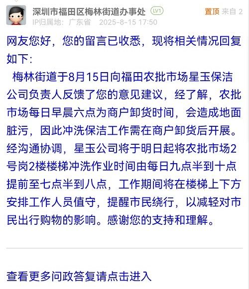 網友您好,您的留言已收悉,現將相關情況回復如下:梅林街道于8月15日向福田農批市場星玉保潔公司負責人反饋了您的意見建議,經了解,農批市場每日早晨六點為商戶卸貨時間,會造成地面臟污,因此沖洗保潔工作需在商戶卸貨后開展。經溝通協(xié)調,星玉公司將于明日起將農批市場2號崗2樓樓梯沖洗作業(yè)時間由每日九點半到十點提前至七點半到八點,工作期間將在樓梯上下方安排工作人員值守,提醒市民繞行,以減輕對市民出行購物的影響。感謝您的支持和理解。
