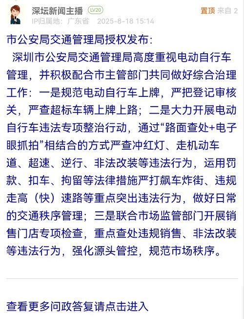 深圳市公安局交通管理局高度重視電動自行車管理,并積極配合市主管部門共同做好綜合治理工作:一是規(guī)范電動自行車上牌,嚴把登記審核關,嚴查超標車輛上牌上路;二是大力開展電動自行車違法專項整治行動,通過“路面查處+電子眼抓拍”相結合的方式嚴查沖紅燈、走機動車道、超速、逆行、非法改裝等違法行為,運用罰款、扣車、拘留等法律措施嚴打飆車炸街、違規(guī)走高(快)速路等重點突出違法行為,做好日常的交通秩序管理;三是聯合市場監(jiān)管部門開展銷售門店專項檢查,重點查處違規(guī)銷售、非法改裝等違法行為,強化源頭管控,規(guī)范市場秩序。