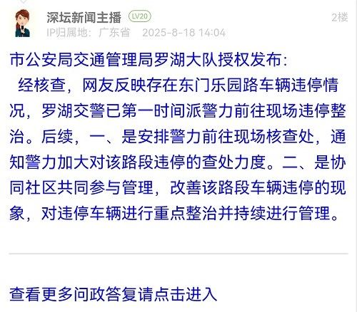 經核查,網友反映存在東門樂園路車輛違停情況,羅湖交警已第一時間派警力前往現場違停整治。后續(xù),一、是安排警力前往現場核查處,通知警力加大對該路段違停的查處力度。二、是協(xié)同社區(qū)共同參與管理,改善該路段車輛違停的現象,對違停車輛進行重點整治并持續(xù)進行管理。