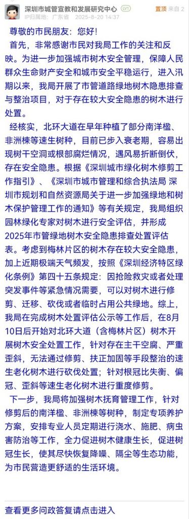 經核實,北環(huán)大道在早年種植了部分南洋楹、非洲楝等速生樹種,目前已步入衰老期,容易出現樹干空洞或根部腐爛情況,遇風易折斷倒伏,存在安全隱患。根據《深圳城市綠化樹木修剪工作指引》、《深圳市城市管理和綜合執(zhí)法局 深圳市規(guī)劃和自然資源局關于進一步加強綠地和樹木保護管理工作的通知》等有關規(guī)定,我局組織園林綠化專家對樹木進行安全評估,并形成2025年市管綠地樹木安全隱患排查處置評估表。考慮到梅林片區(qū)的樹木存在較大安全隱患,加上近期極端天氣頻發(fā),按照《深圳經濟特區(qū)綠化條例》第四十五條規(guī)定:因搶險救災或者處理突發(fā)事件等緊急情況需要,可以對樹木進行修剪、遷移、砍伐或者臨時占用公共綠地。綜上,我局在完成樹木處置評估公示等工作后,在8月10日后開始對北環(huán)大道(含梅林片區(qū))樹木開展樹木安全處置工作,針對存在主干空腐、嚴重歪斜,無法通過修剪、扶正加固等手段整治的速生老化樹木進行砍伐處置;針對根冠比失衡、偏冠、歪斜等速生老化樹木進行重度修剪。