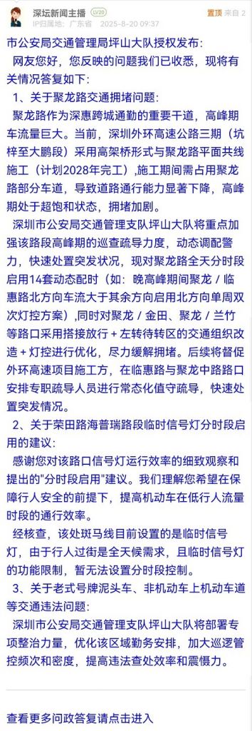 深圳市公安局交通管理支隊坪山大隊將重點加強該路段高峰期的巡查疏導力度,動態(tài)調配警力,快速處置突發(fā)狀況,現對聚龍路全天分時段啟用14套動態(tài)配時(如:晚高峰期間聚龍/臨惠路北方向車流大于其余方向啟用北方向單周雙次燈控方案),同時對聚龍/金田、聚龍/蘭竹等路口采用搭接放行+左轉待轉區(qū)的交通組織改造+燈控進行優(yōu)化,盡力緩解擁堵。后續(xù)將督促外環(huán)高速項目施工方,在臨惠路與聚龍中路路口安排專職疏導人員進行常態(tài)化值守疏導,快速處置突發(fā)情況。