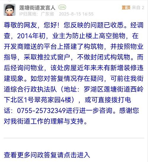 尊敬的網友,您好!您反映的問題已收悉。經調查,2014年初,業(yè)主為防止樓上高空拋物,在開發(fā)商贈送的平臺上搭建了構筑物,并按照物業(yè)指導,采取推拉式窗戶,不做封閉式構筑物。而后經詢問物業(yè),該處房屋近年來未有新增裝修違建現象。如您對答復情況存在疑問,可前往我街道綜合行政執(zhí)法隊(地址:羅湖區(qū)蓮塘街道西嶺下北區(qū)1號翠苑家園4樓),或可直接撥打電話:0755-25732349進行進一步咨詢。感謝您對我街道工作的理解與支持。