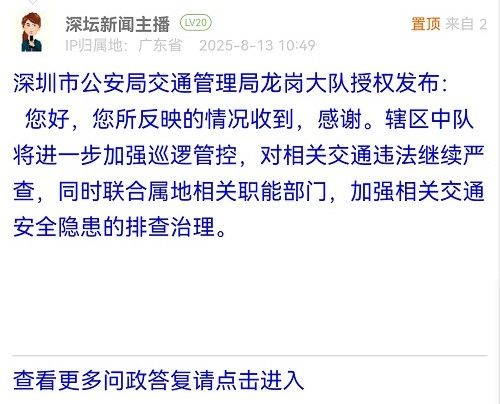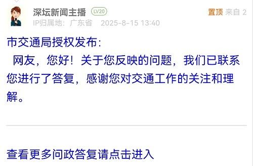 各職能單位如需對網友反映的問題進行回應,可在深圳論壇注冊官方賬號并通過認證,回帖進行回應。