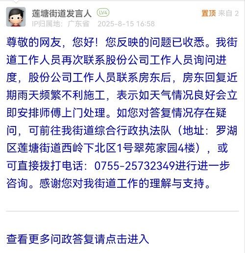 尊敬的網友,您好!您反映的問題已收悉。我街道工作人員再次聯系股份公司工作人員詢問進度,股份公司工作人員聯系房東后,房東回復近期雨天頻繁不利施工,表示如天氣情況良好會立即安排師傅上門處理。如您對答復情況存在疑問,可前往我街道綜合行政執(zhí)法隊(地址:羅湖區(qū)蓮塘街道西嶺下北區(qū)1號翠苑家園4樓),或可直接撥打電話:0755-25732349進行進一步咨詢。感謝您對我街道工作的理解與支持。