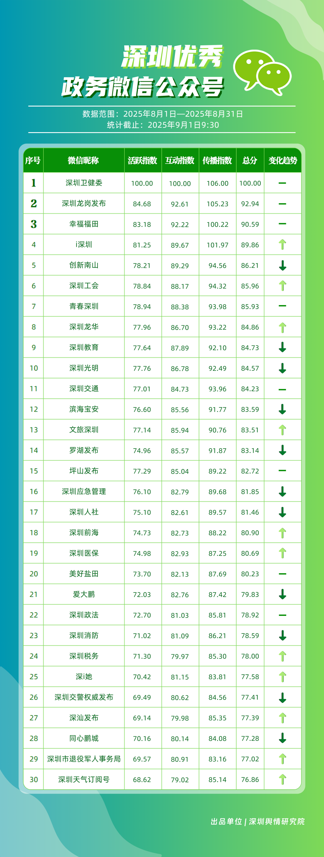 8月,30個(gè)政務(wù)微信公眾號(hào)入選“深圳優(yōu)秀政務(wù)微信公眾號(hào)”榜單,其中包括“深圳衛(wèi)健委”“深圳龍崗發(fā)布”“幸福福田”“i深圳”“創(chuàng)新南山”“深圳工會(huì)”“青春深圳”“深圳龍華”“深圳教育”“深圳光明”等。8月,“深圳衛(wèi)健委”66篇推文獲得超10萬(wàn)次閱讀,以滿分位于榜單首位;“深圳龍崗發(fā)布”積極傳遞民生信息,依托區(qū)域活動(dòng)開(kāi)展宣傳,推動(dòng)傳播效果顯著提升,位居第二;“幸福福田”關(guān)注區(qū)域發(fā)展動(dòng)態(tài),排名第三?!癷深圳”“創(chuàng)新南山”“深圳工會(huì)”“青春深圳”等政務(wù)賬號(hào)在信息發(fā)布中不斷提升內(nèi)容豐富性,深耕優(yōu)質(zhì)服務(wù),評(píng)分在85分以上。上榜微信公眾號(hào)立足自身特色優(yōu)勢(shì),以精品內(nèi)容為核心競(jìng)爭(zhēng)力,在政務(wù)傳播領(lǐng)域樹(shù)立了標(biāo)桿形象,成為兼具影響力與公信力的示范樣本。