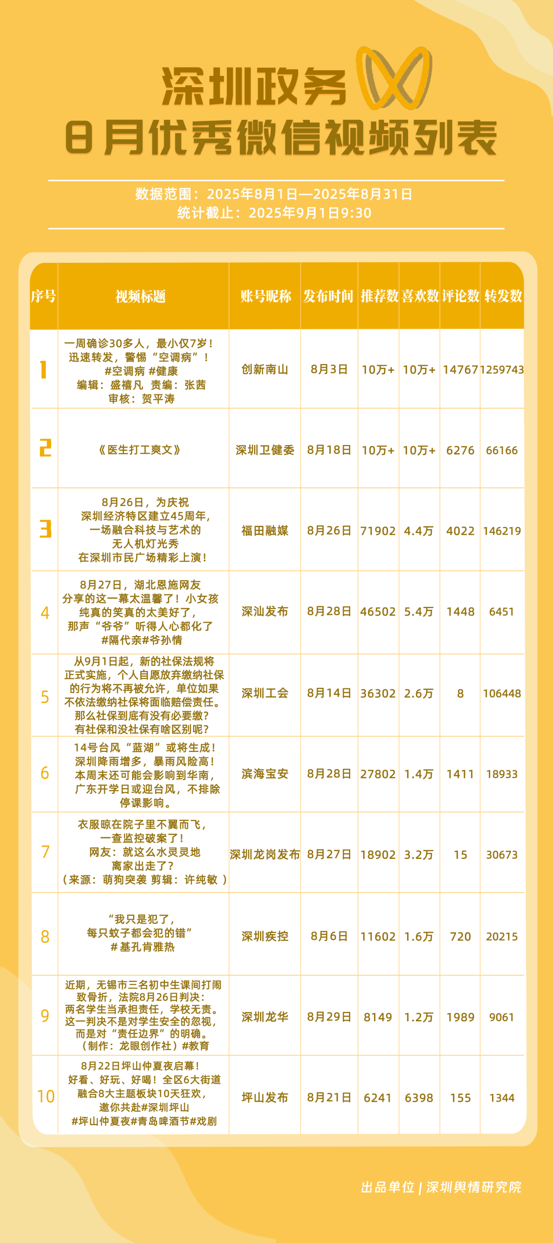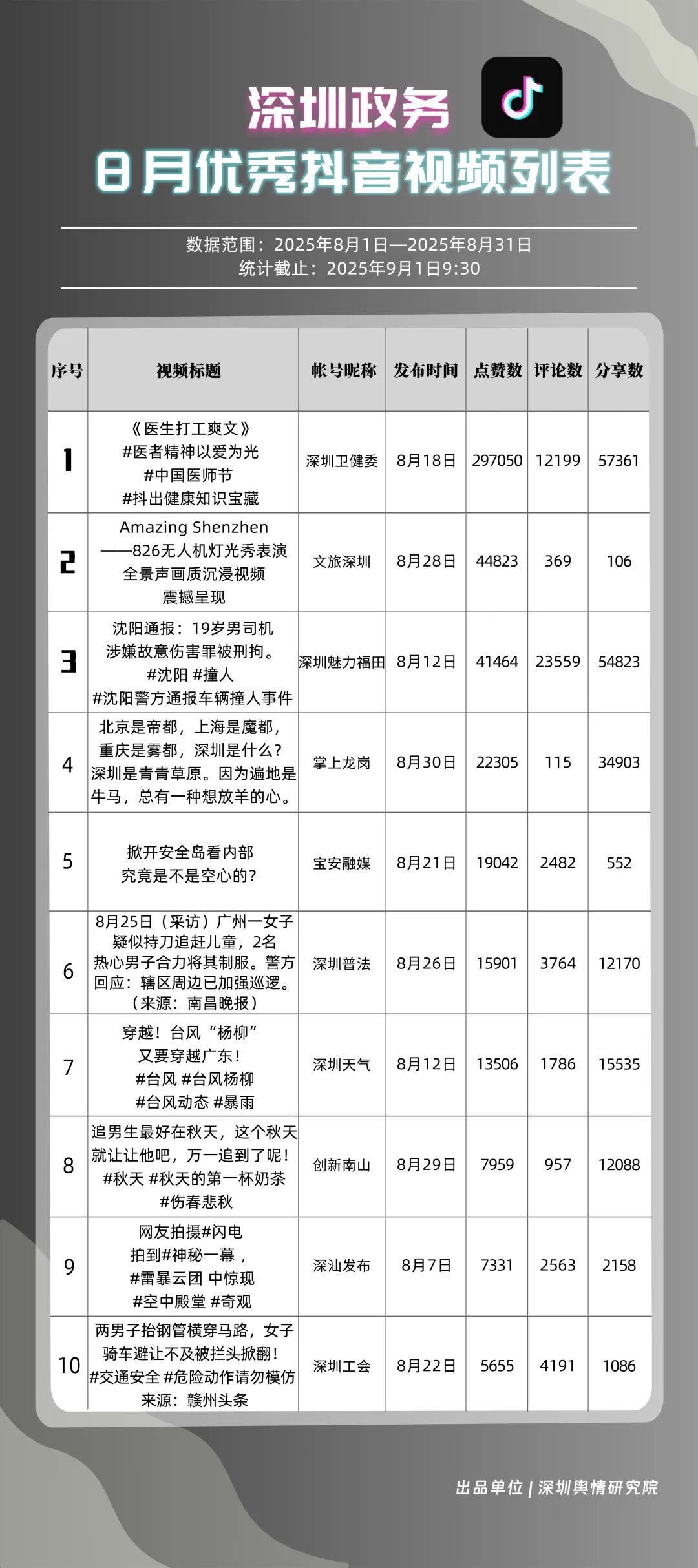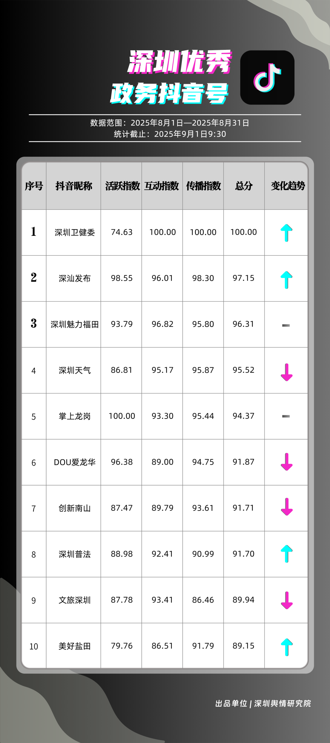 8月,“深圳衛(wèi)健委”“深汕發(fā)布”“深圳魅力福田”“深圳天氣”“掌上龍崗”“DOU愛(ài)龍華”“創(chuàng)新南山”“深圳普法”“文旅深圳”“美好鹽田”共10個(gè)政務(wù)抖音號(hào)獲得“優(yōu)秀政務(wù)抖音號(hào)”稱號(hào)?!吧钲谛l(wèi)健委”內(nèi)容吸引大量網(wǎng)民關(guān)注,4條視頻累計(jì)獲得超50萬(wàn)次點(diǎn)贊,排名從上期的第九名上升至第一名;“深汕發(fā)布”憑借較高的傳播指數(shù)評(píng)分,位列第二名,排名有所上升。“深圳魅力福田”“深圳天氣”等賬號(hào)緊隨其后,得分均在95分左右。上榜的優(yōu)秀政務(wù)抖音號(hào)深耕優(yōu)質(zhì)創(chuàng)作,精準(zhǔn)把握網(wǎng)民興趣點(diǎn),使作品收獲高點(diǎn)贊、高轉(zhuǎn)發(fā),推動(dòng)評(píng)論區(qū)形成良性互動(dòng)氛圍,以優(yōu)秀內(nèi)容提升政務(wù)傳播效能。