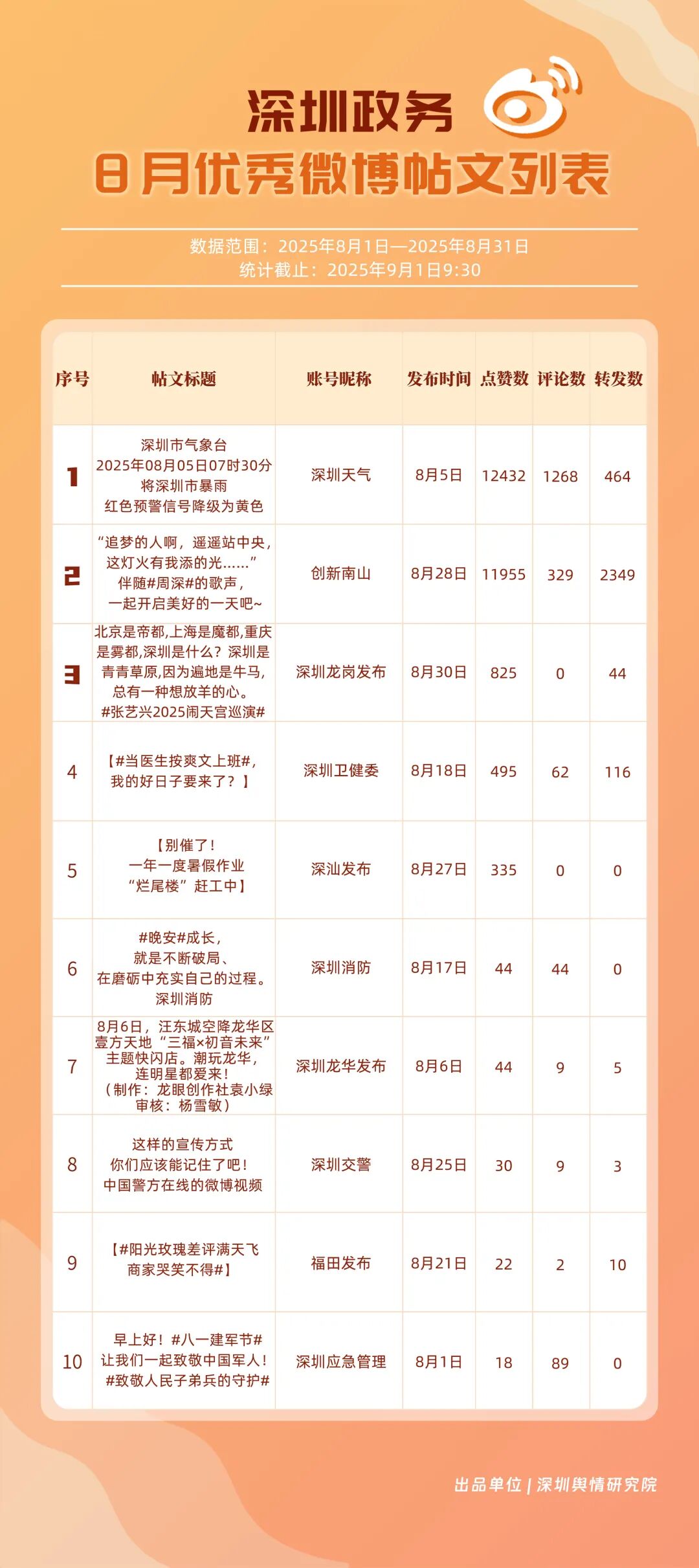 8月,“深圳幸福福田”“深圳消防”“深圳衛(wèi)健委”“創(chuàng)新南山”“深圳人社”“羅湖發(fā)布”“深圳龍崗發(fā)布”“深圳龍華”“青春深圳”“坪山發(fā)布”共10個(gè)政務(wù)頭條號(hào)入選“優(yōu)秀政務(wù)頭條號(hào)”榜單?!吧钲谛腋8L铩睉{借持續(xù)優(yōu)異的綜合表現(xiàn),以滿分成績(jī)穩(wěn)居榜單首位,彰顯出強(qiáng)大的政務(wù)傳播力與影響力;“深圳消防”“深圳衛(wèi)健委”則以穩(wěn)定的內(nèi)容質(zhì)量與深厚的民眾基礎(chǔ),持續(xù)為市民提供權(quán)威、及時(shí)的服務(wù)信息,排名穩(wěn)固?!皠?chuàng)新南山”“深圳人社”等上榜賬號(hào)亦表現(xiàn)亮眼,聚焦民生服務(wù)傳遞政策溫度,共同構(gòu)成政務(wù)新媒體矩陣的中堅(jiān)力量,為城市治理與民生服務(wù)注入鮮活動(dòng)能。