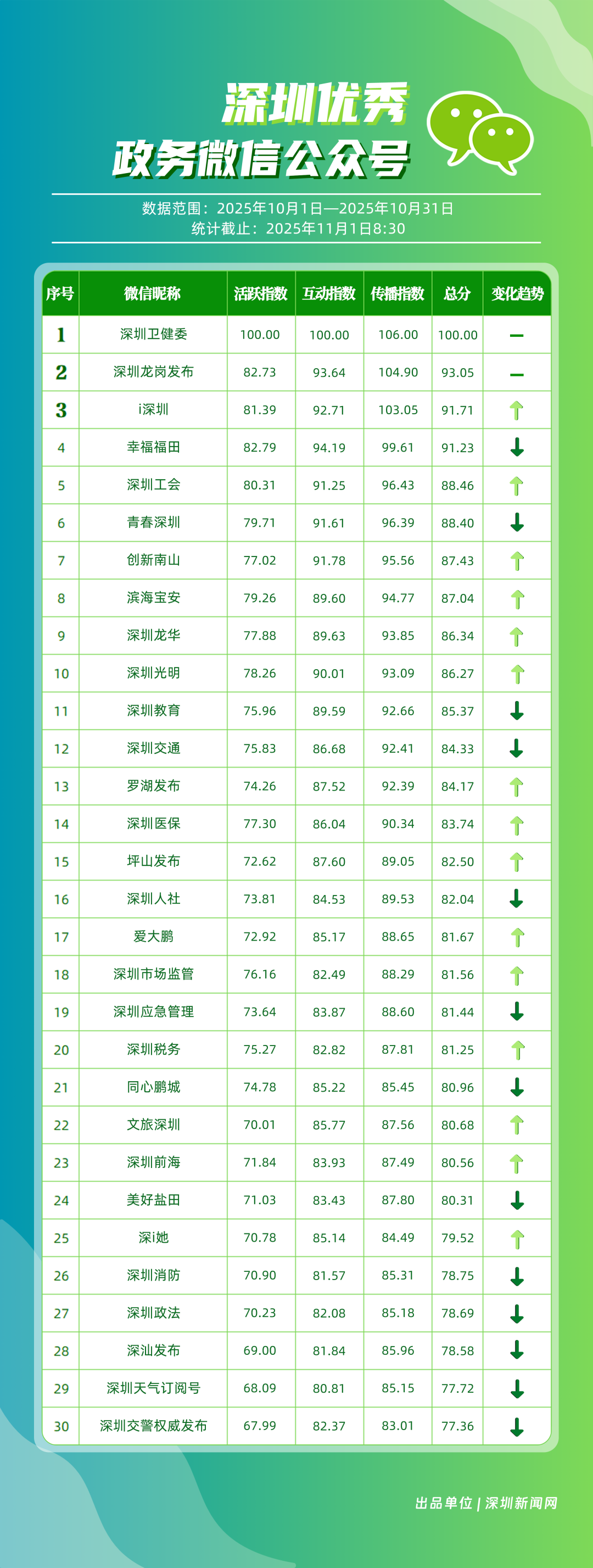 10月,“深圳衛(wèi)健委”“深圳龍崗發(fā)布”“i深圳”“幸福福田”“深圳工會(huì)”“青春深圳”“創(chuàng)新南山”“濱海寶安”“深圳龍華”“深圳光明”等30個(gè)政務(wù)微信公眾號(hào)榮登“深圳優(yōu)秀政務(wù)微信公眾號(hào)”榜單。10月,“深圳衛(wèi)健委”以總分100位居榜首,其持續(xù)以真誠(chéng)、反套路的內(nèi)容,將專業(yè)健康知識(shí)轉(zhuǎn)化為網(wǎng)民喜聞樂(lè)見的“生活指南”,受到大量網(wǎng)民喜愛(ài);“深圳龍崗發(fā)布”位居第二,持續(xù)發(fā)布高質(zhì)量?jī)?nèi)容,成為市民獲取龍崗動(dòng)態(tài)的“第一窗口”;“i深圳”也發(fā)布政策、民生內(nèi)容,排名有所上升,位列第三;“幸福福田”“深圳工會(huì)”等也立足區(qū)域特色,通過(guò)多元內(nèi)容,展現(xiàn)各自的發(fā)展活力。
