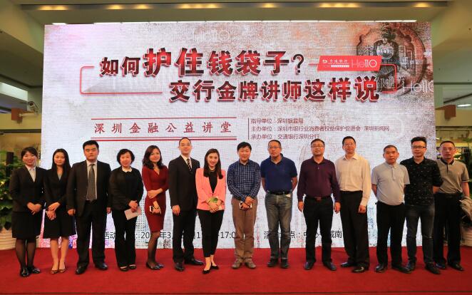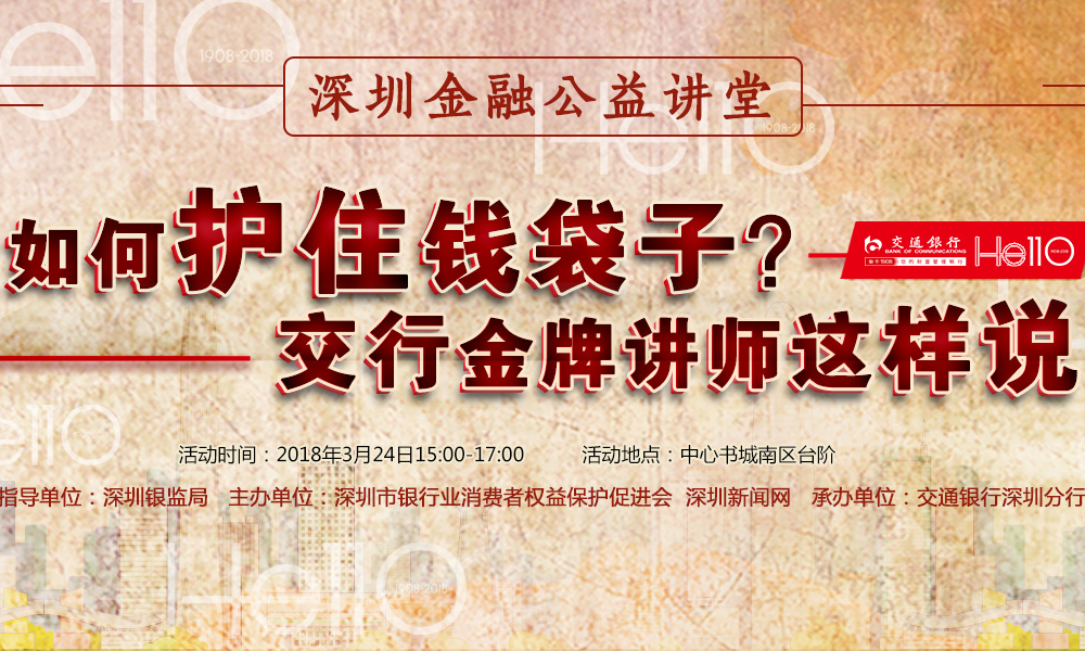 3月24日,深圳新聞網(wǎng)攜手深圳市銀行業(yè)消費者權(quán)益保護(hù)促進(jìn)會舉辦的《深圳金融公益講堂》,將邀請交通銀行深圳分行金牌講師,結(jié)合110周年熱點,回顧交行百年歷史變遷,分析2018年理財趨勢,著眼消費者權(quán)益保護(hù)話題,以實際案例,深入淺出地開展一堂內(nèi)容豐富實用的金融大講堂。