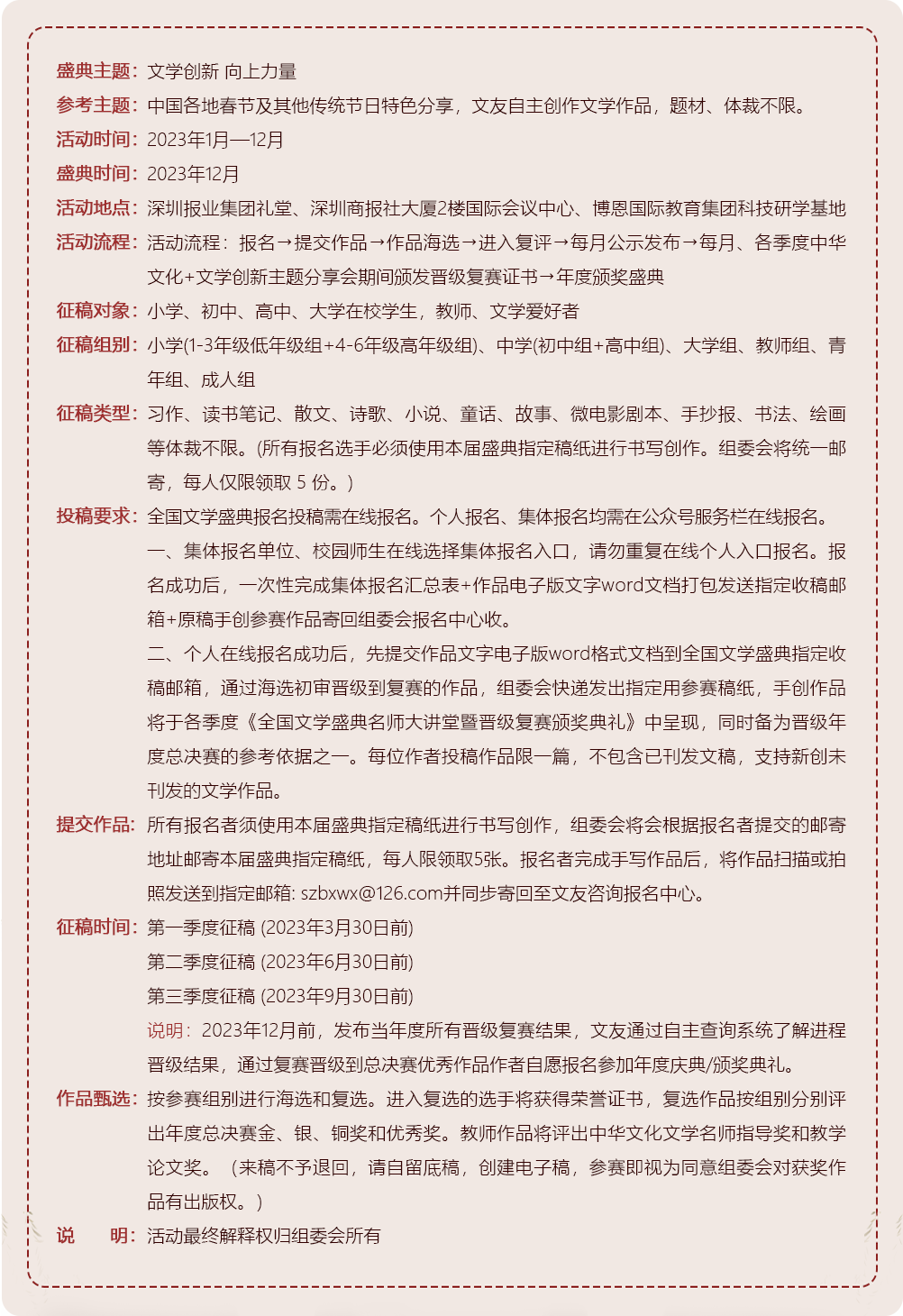 2023年度全國(guó)文學(xué)盛典”是面向小學(xué)、初中、高中學(xué)生,以及教師和文學(xué)愛(ài)好者而開(kāi)展的文學(xué)系列活動(dòng),將文學(xué)的魅力持續(xù)傳播。廣大文學(xué)愛(ài)好者自愿報(bào)名參加。在本屆活動(dòng)進(jìn)程中,將繼續(xù)為孩子和文學(xué)愛(ài)好者們創(chuàng)建其熱愛(ài)的中華文化文學(xué)創(chuàng)作的滋養(yǎng)平臺(tái),為文學(xué)愛(ài)好者和優(yōu)秀的文學(xué)特長(zhǎng)生提供更廣闊的創(chuàng)作實(shí)踐平臺(tái)。教育界學(xué)術(shù)研究領(lǐng)域?qū)<医淌凇⒆骷?、?shī)人、文學(xué)評(píng)論家等組成的專(zhuān)家評(píng)審委員會(huì)本著公開(kāi)、公平、公正的原則,對(duì)參評(píng)作品進(jìn)行審評(píng)。 組委會(huì)在廣大師生文友的支持與建議下,“2023年度全國(guó)文學(xué)盛典”將持續(xù)開(kāi)展系列文創(chuàng)主題活動(dòng):“全國(guó)文學(xué)盛典之走進(jìn)名師”“全國(guó)青少年冰心文學(xué)盛典2023”、教育部創(chuàng)刊中國(guó)校園文學(xué)《一起向未來(lái)·中國(guó)校園文學(xué)》主題征投稿、“校園專(zhuān)場(chǎng)”“專(zhuān)家分享會(huì)”“文學(xué)創(chuàng)新 向上力量——專(zhuān)家進(jìn)校園”“全國(guó)文學(xué)盛典·各季品質(zhì)典禮”“優(yōu)秀作品校園巡展”等等。為參賽選手提供廣泛的交流、學(xué)習(xí)、鍛煉機(jī)會(huì)和展示平臺(tái)。>>>