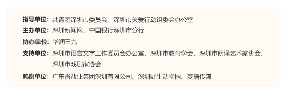 為助力建設(shè)良好的青少年閱讀環(huán)境,激發(fā)學生閱讀興趣,倡導親子閱讀,共建和諧家庭關(guān)系。2022年,“誰是故事大王·第六季”在共青團深圳市委員會、深圳市關(guān)愛行動組委會辦公室的指導下再出發(fā)?;顒佑缮钲谛侣劸W(wǎng)、中國銀行深圳市分行主辦,華潤三九協(xié)辦,得到了廣東省鹽業(yè)集團深圳有限公司、深圳野生動物園、麥禧傳媒的大力支持。更長的活動周期,更豐富的參與形式,更專業(yè)的賽制,等你來解鎖與挑戰(zhàn)!讓閱讀成為最動人的風景,讓故事的魅力感動深圳。說明:所有參賽者報名成功后,均承認并允許主辦方將個人參加本次活動的照片或視頻相關(guān)資料刊發(fā)在各類媒體雜志報紙上,用于活動宣傳。